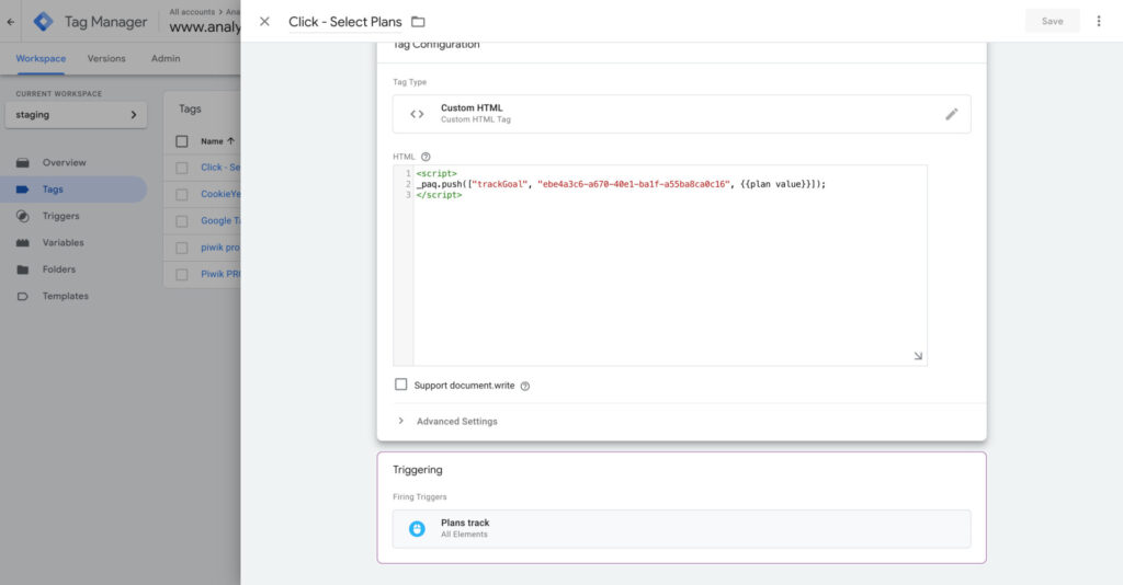 Section titled “Track goal manually using Piwik pro Tag Manager”