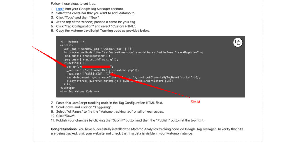 We need to add the link to our Matomo instance and the site ID. You can find this information by selecting GTM as the installation method. Next, copy the site ID and instance Link