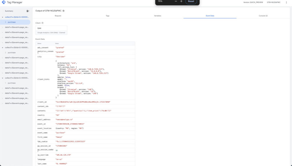 We will use this data layer for purchase event. This data layer format provides all necessary information for Facebook’s Conversion API, including transaction details, product information, and user data. The structure maps cleanly to Facebook’s required parameters, with transaction values in the ecommerce object and customer information in the user_data object.