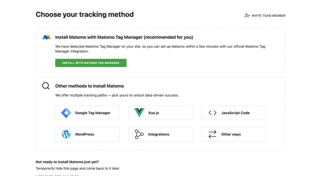 Section titled “Method #2: Rent a server from Matomo (Matomo cloud)”You can use Matomo’s servers instead. Go with this option if you don’t want to manage the technical part of setting up and maintaining a server.