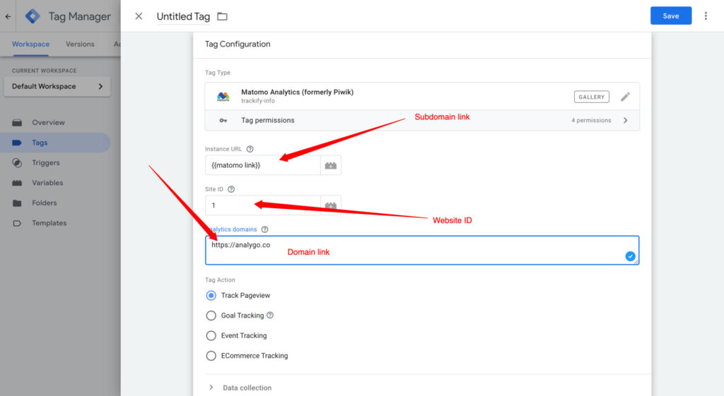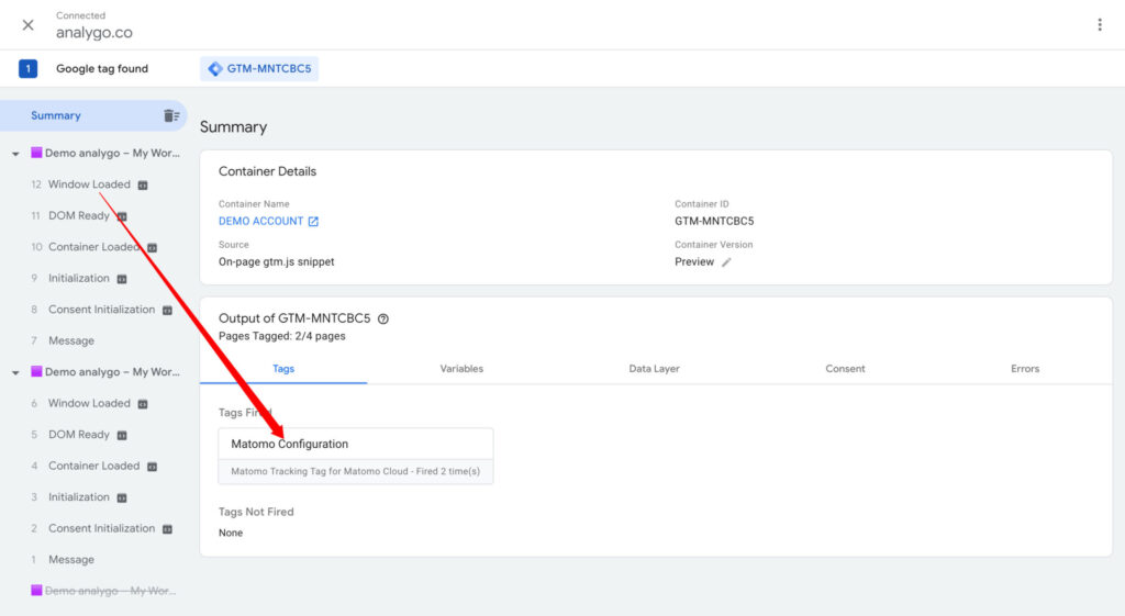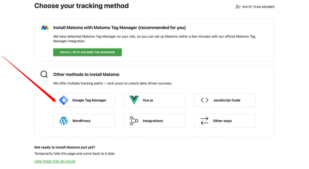 Section titled “How to configure Matomo with Google Tag Manager”At this point, you hosted Matomo either on your server or used Matomo Cloud, but it’s not yet connected to your website. There are many ways to do this. We will use Google Tag Manager (GTM) to add the configuration script.