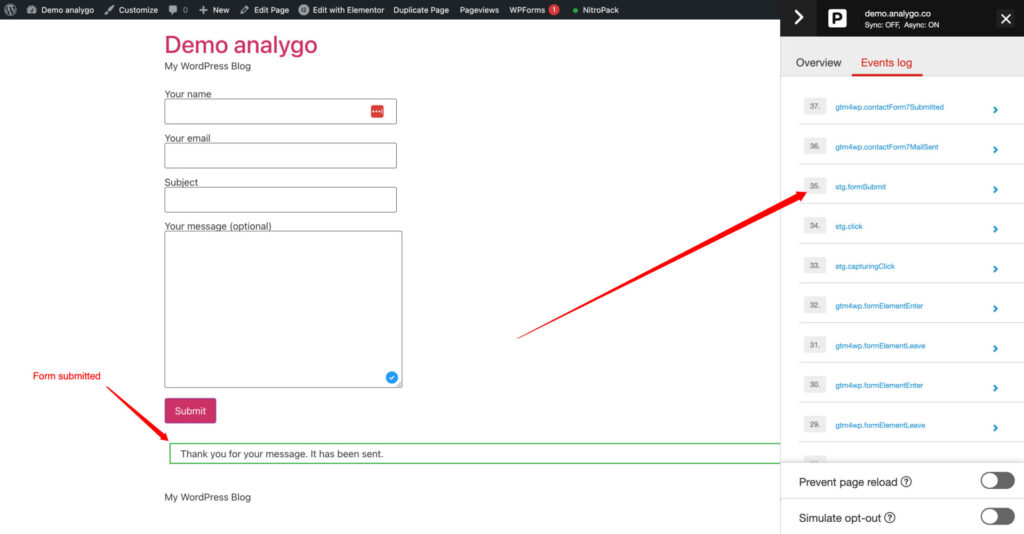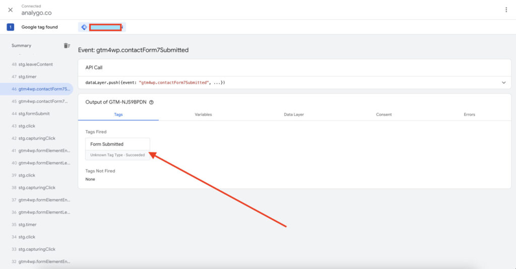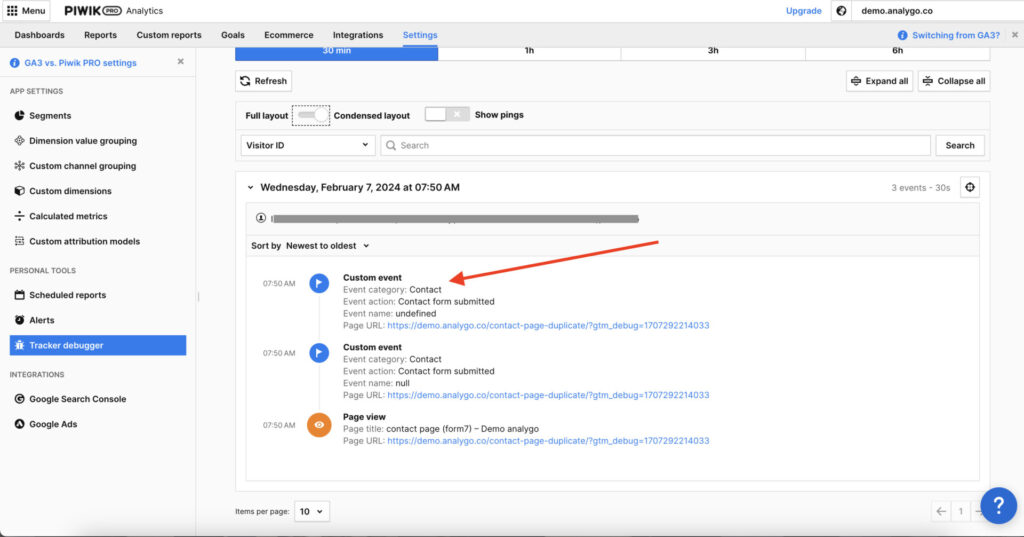 After submitting another form, the GTM tag is firing correctly. Let’s take a look at the debug view in Piwik pro to see if we can capture the event there as well.