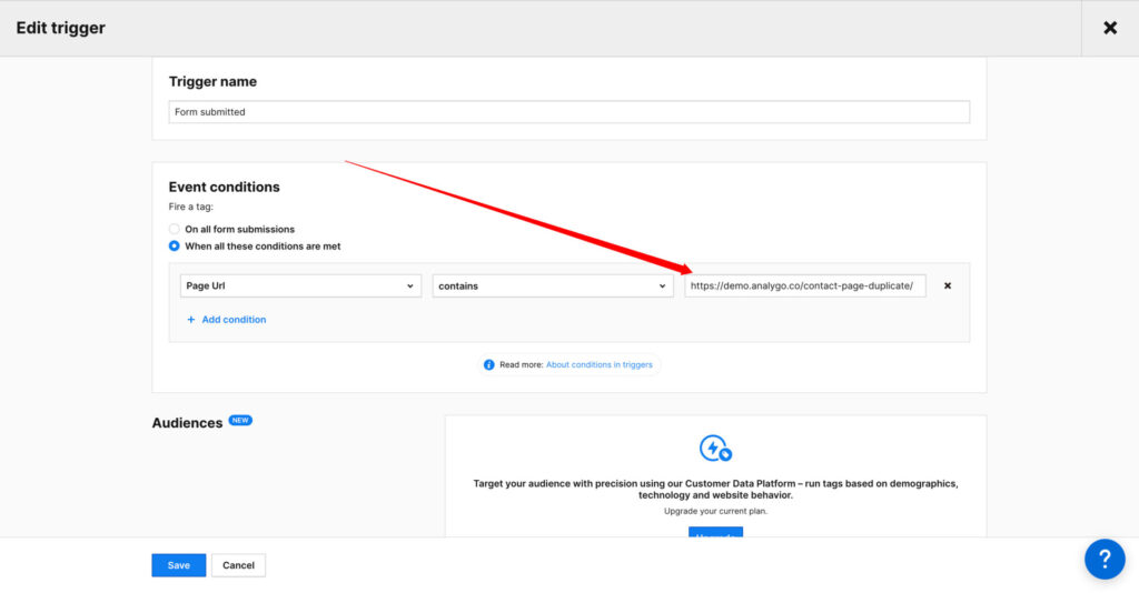 Section titled “Add a Trigger to Piwik Pro tag”Finally, we can add the trigger. Piwik pro has a trigger that fires when a user submits a form called “Form submission”.