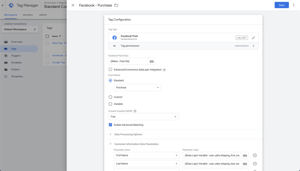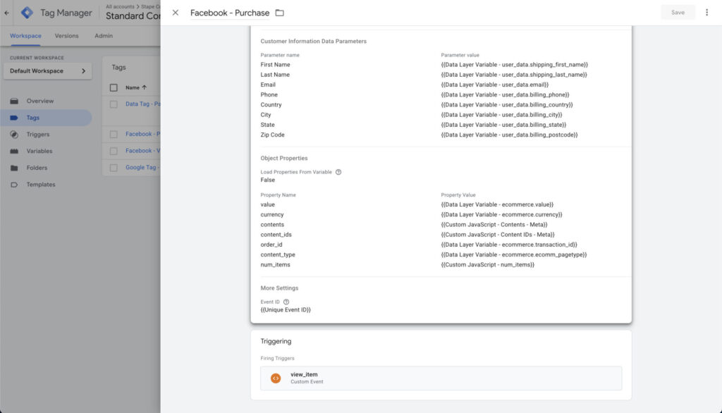 { "event": "purchase", "ecomm_pagetype": "purchase", "ecommerce": { "transaction_id": "71", "affiliation": "Online Academy", "value": "160.00", "tax": "0.00", "shipping": "0.00", "currency": "USD", "coupon": "SAVE20", "discount_amount": "40.00", "items": [ { "item_name": "GTM - course", "item_brand": "Analygo", "item_id": "67", "item_sku": "GTM-COURSE-67", "price": "100.00", "imageUrl": "https://example.com/images/gtm-course.jpg", "item_category": "Analytics", "discount": "20.00", "quantity": 1, "index": 1 }, { "item_name": "GA4 - course", "item_brand": "Analygo", "item_id": "68", "item_sku": "GA4-COURSE-68", "price": "100.00", "imageUrl": "https://example.com/images/ga4-course.jpg", "item_category": "Tracking", "discount": "20.00", "quantity": 1, "index": 2 } ] }, "user_data": { "customer_id": "CUST-00071", "billing_first_name": "Alex", "billing_last_name": "Morgan", "billing_address": "123 Elm Street, Apt 4B", "billing_postcode": "10001", "billing_country": "US", "billing_state": "NY", "billing_city": "New York", "billing_phone": "+1-212-555-0183", "shipping_first_name": "Alex", "shipping_last_name": "Morgan", "shipping_address": "123 Elm Street, Apt 4B", "shipping_postcode": "10001", "shipping_country": "US", "shipping_state": "NY", "shipping_city": "New York", "shipping_phone": "+1-212-555-0183", "new_customer": "true" }, "gtm.uniqueEventId": 7}All we have to do is to map these values using the documentation. Let’s start by adding the web Facebook tag along with other all relevant fields.