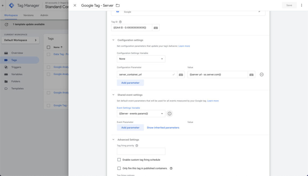 Since we created a shared events setting earlier, we won’t need to add parameters such as server URL for each individual tag. All parameters we need will be available by default as long as we don’t forget to add the event settings variable.