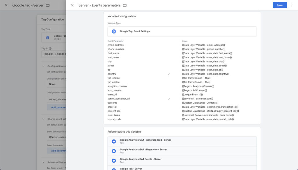 Section titled “Example: E-commerce (client-side configuration)”We will use a Google Tag as a way to transfer data from browser to server. This is accomplished by adding an extra field, the server_container_url, in the Configuration settings section.This field works alongside other parameters you want to send to the server, such as email, first_name, etc.