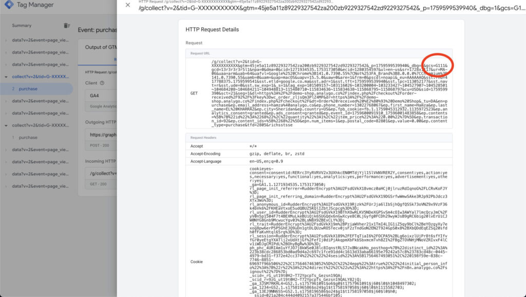 Section titled “Debugging Consent Mode Implementation”When Consent Mode is active, either in Basic or Advanced Mode, there are additional parameters sent with each analytics and advertising request to Google’s services.