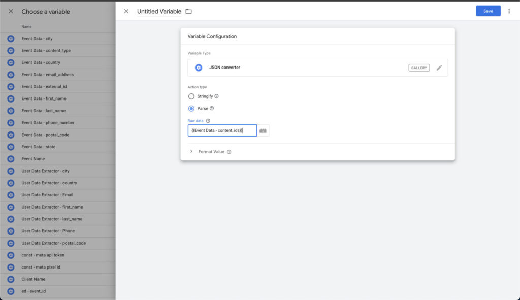 function() { var items = {{Data Layer Variable - ecommerce.items}}; if (!Array.isArray(items)) return []; return items.map(function(item) { return { id: item.item_id, name: item.item_name, content_category: item.item_category, item_price: item.price, quantity: item.quantity }; });}If you don’t want to use JavaScript, another alternative is to rely on Universal Conversions variable. How it works is fairly simple: you provide it with the items array, add the names of the parameters (e.g., item_name), and it will map this to Facebook’s format.