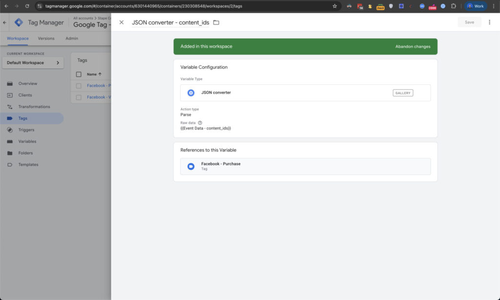 We will use a template by Stape called JSON converter. It will parse the string and convert it back to JSON format.