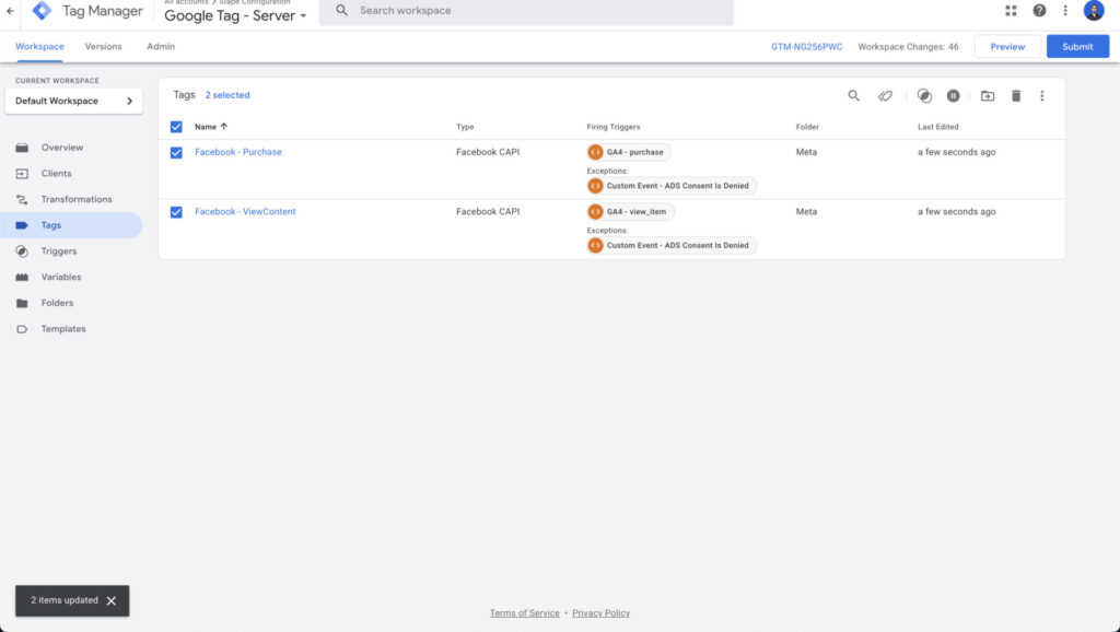 Alternatively, you can use a variable like items and let the Facebook server tag handle the rest, but we prefer to control what data is passed and how (adding our custom logic).