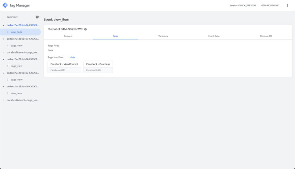 dataLayer.push({ event: "view_item", user_data: { visitor_type: "logged_in", customer_first_name: "John", customer_last_name: "Smith", customer_phone: "+442071234567", // Include only if available customer_city: "London", customer_zip: "EC1A 1BB", customer_address_1: "45 Baker Street", // Include only if available customer_address_2: "Flat 3", // Include only if available customer_country: "GB", customer_country_code: "GB", user_id: "USER7890" }, ecommerce: { currency: "GBP", // Currency code (ISO 4217) value: 49.99, // Total value of the viewed item items: [ { item_id: "SKU456", item_name: "Organic Whey Protein Powder", affiliation: "Nutrition World", coupon: "HEALTH20", discount: 5.00, index: 0, item_brand: "Pure Nutrition", item_category: "Sports Nutrition", item_category2: "Protein", item_category3: "Whey", item_category4: "Organic", item_category5: "Unflavored", item_list_id: "protein_list", item_list_name: "Protein Products", item_variant: "500g", variant_id: "87654321098765", image: "https://example.com/images/products/organic-whey-protein.jpg", url: "https://example.com/products/organic-whey-protein", selling_plan_name: "subscription", location_id: "ChIJdd4hrwug2EcRmSrV3Vo6llI", price: 49.99, quantity: 1 } ] }});Although the data layer looks quite dense, we are basically sending 2 important arrays: user_data and ecommerce. The user_data array contains customer information for identity matching, while the ecommerce array contains detailed product information including price, currency, and item metadata that Facebook needs for accurate conversion tracking and product catalog integration.