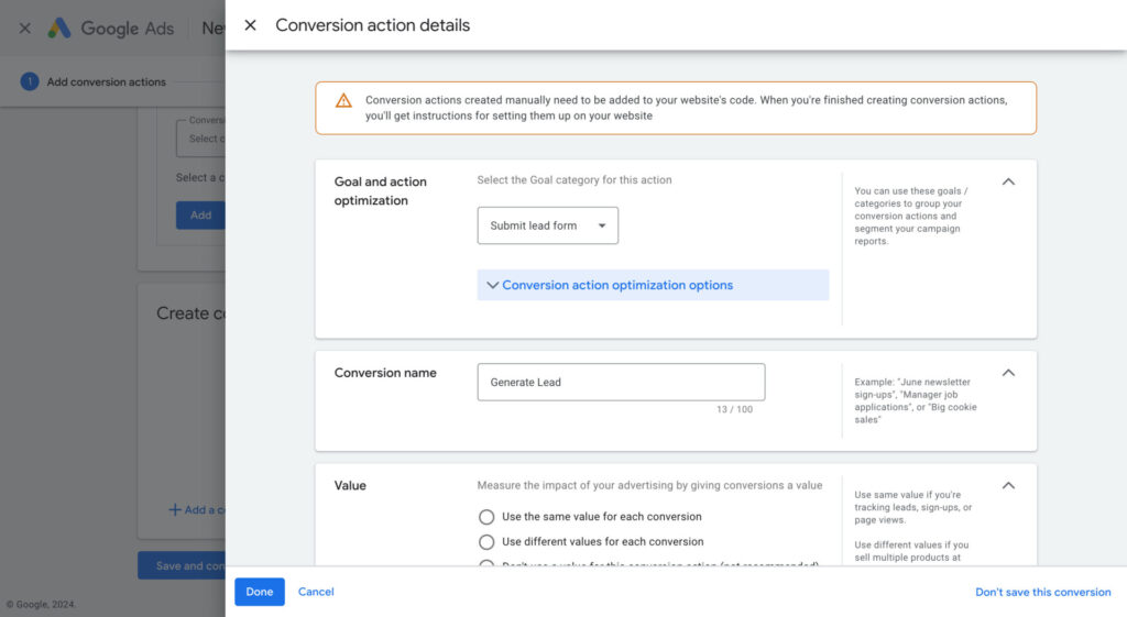 Section titled “Step 2: Create a Google Ads Conversion”Note