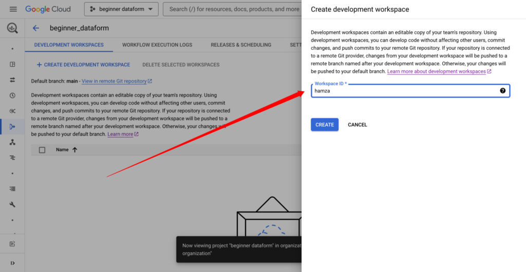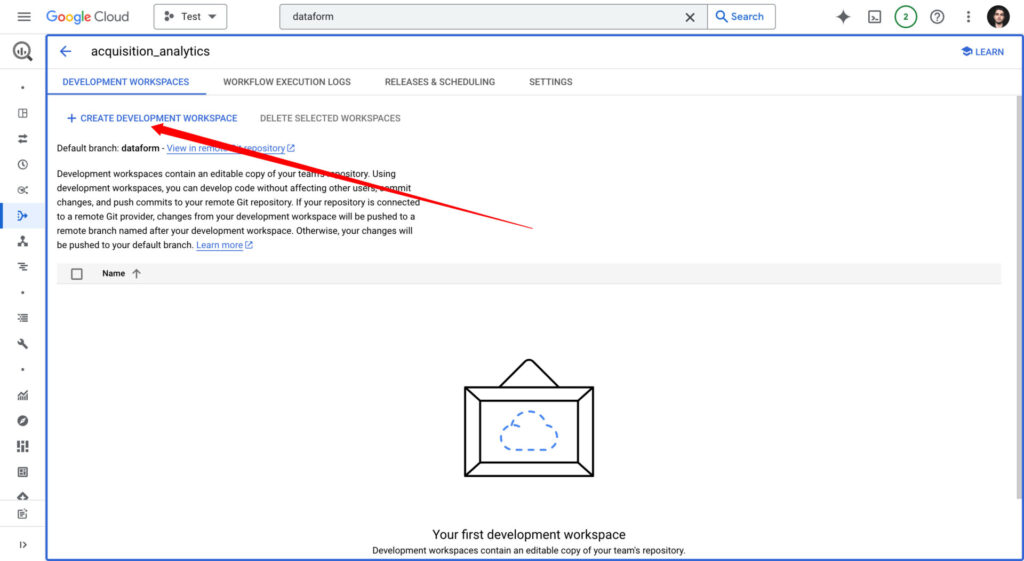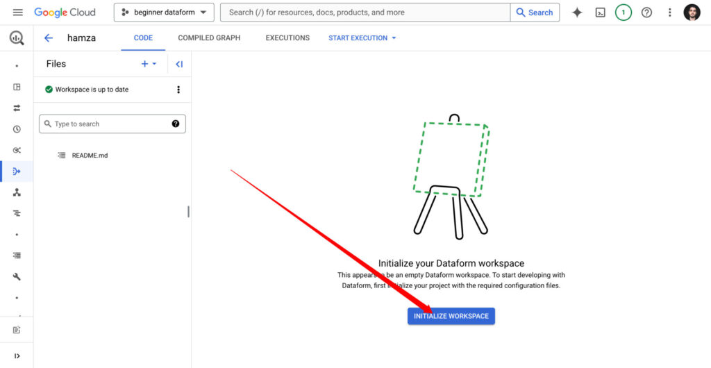 Finally, after clicking on your workspace, you can write some actual code in Dataform. Lets tart by initializing our workspace.