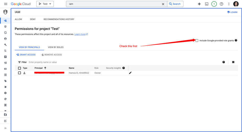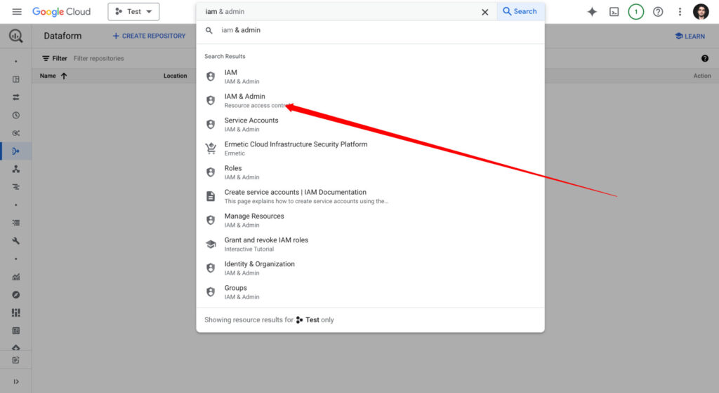 Section titled “Give proper roles”Next, let’s give our newly created repository some basic access. Use the search bar to browse to IAM & Admin.