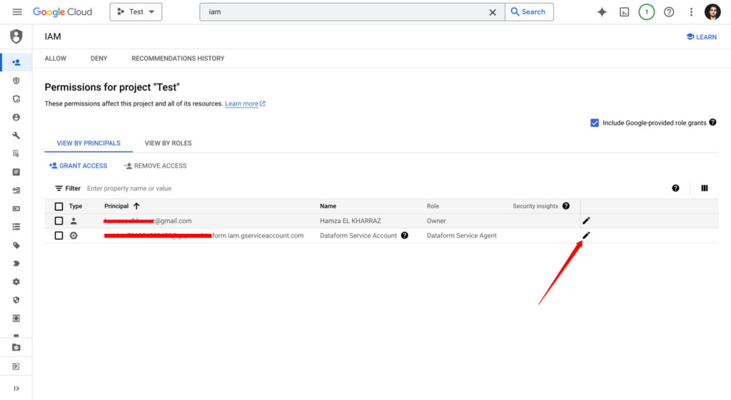 Look for the address we used earlier to create the repository. The name you should look for is Dataform Service Account.