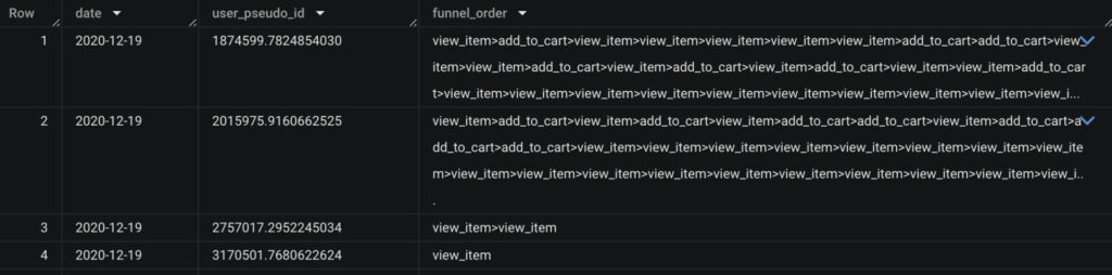 funnel_prep as(select date,user_pseudo_id, string_agg(event_name, ">" order by event_timestamp) as funnel_order from prep_query group by user_pseudo_id,date)Step 2: ordering funnel steps